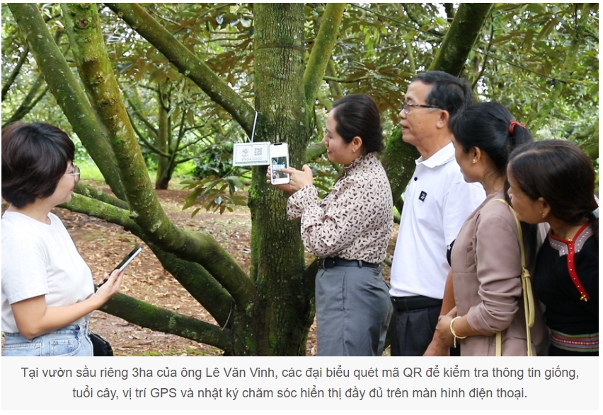 Mỗi cây sầu riêng được cấp một mã định danh kèm thông tin về giống, tuổi cây, vị trí GPS, tình trạng dinh dưỡng, điều kiện thời tiết, nhật ký chăm sóc, năng suất thu hoạch và các giấy chứng nhận vùng trồng. Người tiêu dùng chỉ cần quét mã QR là tra cứu được toàn bộ thông tin minh bạch.