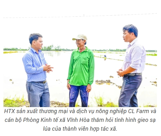 Tại xã Vĩnh Hòa, Hợp tác xã (HTX) sản xuất thương mại và dịch vụ nông nghiệp CL Farm gieo sạ vụ lúa đông xuân bằng máy bay không người lái (drone). Trước đây, người dân phải thuê sạ bằng tay, vừa tốn công, tốn giống, lại không đều hàng, thì nay, chỉ trong vài giờ, cả cánh đồng rộng hàng chục héc-ta được gieo sạ hoàn chỉnh.