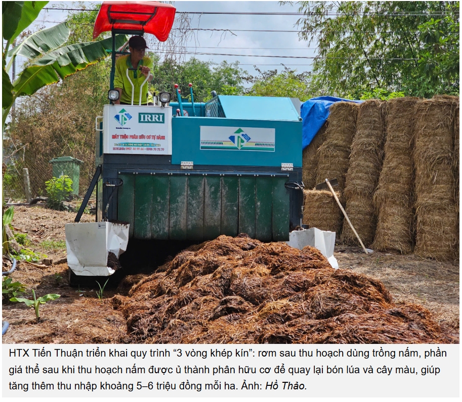 Trên thực tế, mô hình nông nghiệp tuần hoàn từ rơm rạ đã được áp dụng thành công tại nhiều nơi. Điển hình, tại Cần Thơ, HTX Tiến Thuận triển khai quy trình “3 vòng khép kín”: rơm sau thu hoạch dùng trồng nấm, phần giá thể sau khi thu hoạch nấm được ủ thành phân hữu cơ để quay lại bón lúa và cây màu.