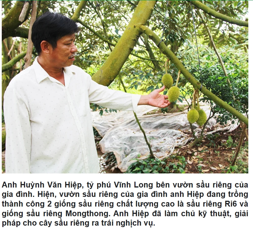 Anh Huỳnh Văn Hiệp, tỷ phú Vĩnh Long bên vườn sầu riêng của gia đình. Hiện, vườn sầu riêng của gia đình anh Hiệp đang trồng thành công 2 giống sầu riêng chất lượng cao là sầu riêng Ri6 và giống sầu riêng Mongthong. Anh Hiệp đã làm chủ kỹ thuật, giải pháp cho cây sầu riêng ra trái nghịch vụ.