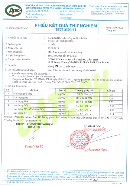 Trung tâm Kỹ thuật tiêu chuẩn Đo lường chất lượng Cần Thơ đã thực hiện lấy mẫu và phân tích các mẫu về môi trường tại XN Phân Bón của quý 3 năm 2025. Kết quả có được như sau