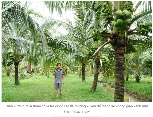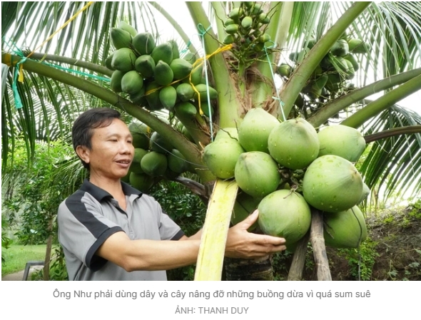 Với những người yêu thiên nhiên, đặc biệt là nông dân thích trồng trọt thì khi vào vườn dừa của ông Như chắc hẳn đều thấy mê. Có cây dừa buồng trái sum suê, chỉ cao hơn mặt đất khoảng nửa mét, muốn hái cũng rất dễ dàng. Những cây cao hơn đầu người một chút, đang vào độ sinh trưởng tốt thì buồng này nằm sát buồng kia, trái chi chít khó mà đếm xuể.