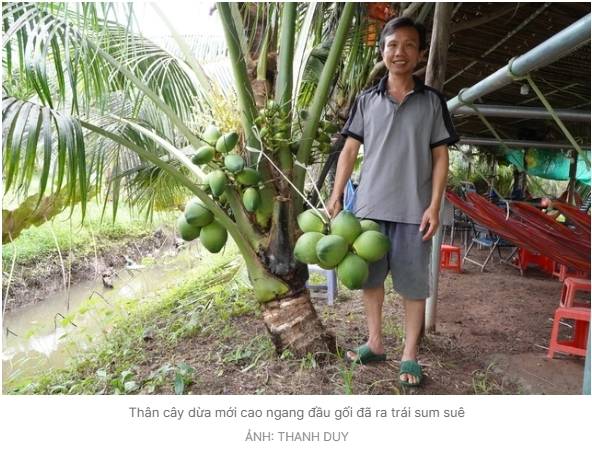 Sau 5 năm kinh nghiệm, ông Phan Hữu Như (49 tuổi, cồn Sơn, P.Bình Thủy, TP.Cần Thơ) trồng được giống dừa lùn vỏ mỏng, nước ngọt thanh. Thân cây cao ngang đầu gối là ra trái sum suê quanh năm.
