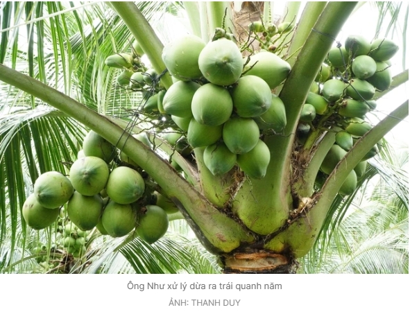 Đặc biệt, đam mê càng cao khi sau 4 năm trồng dừa (năm 2024), ông Như xử lý thành công cho dừa ra trái quanh năm. "Thông thường, giống dừa này chỉ cho trái đồng loạt 2-3 lần trong năm, tức có khoảng thời gian cây nghỉ ngơi không cho trái. Vườn dừa của tôi thì có thể cho trái từ tháng này qua tháng khác. Tất nhiên, để làm được điều này, cần chế độ chăm sóc, bón phân rất đặc biệt", ông Như từ chối nói sâu hơn vì đây là bí quyết của mình.