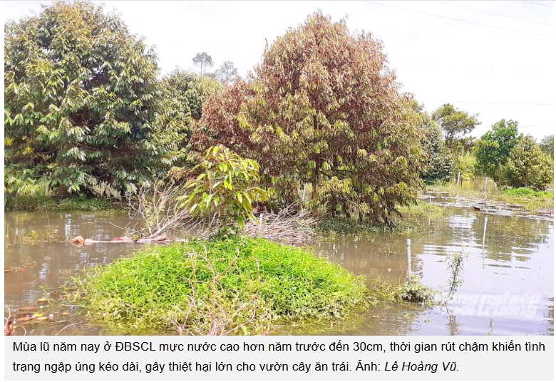 Mùa lũ năm nay ở ĐBSCL mực nước cao hơn năm trước đến 30cm, thời gian rút chậm khiến tình trạng ngập úng kéo dài, gây thiệt hại lớn cho vườn cây ăn trái.