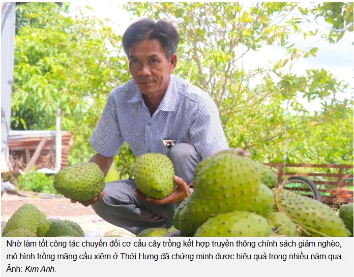 Từ chỗ còn lúng túng, chưa định hình được loại cây trồng phù hợp, thông qua các hoạt động truyền thông chính sách và chương trình giảm nghèo đã tạo bước chuyển căn bản trong nhận thức của nông dân Thới Hưng. Bà con được tiếp cận kỹ thuật, thị trường, được hỗ trợ vốn, kết nối vào các mô hình hợp tác, phát triển mô hình mãng cầu xiêm bền vững hơn.