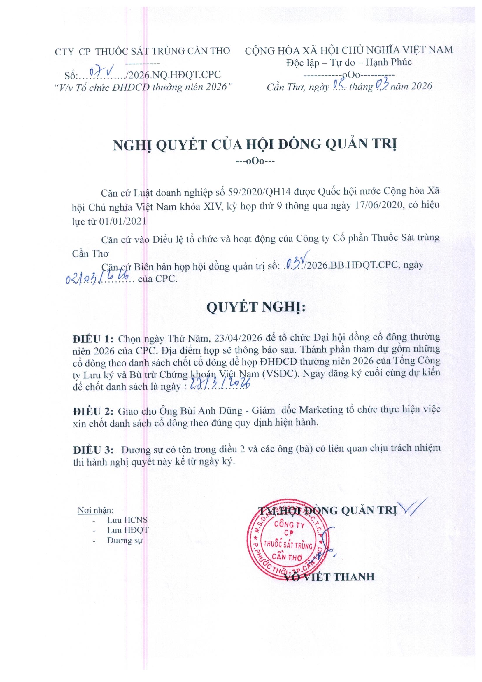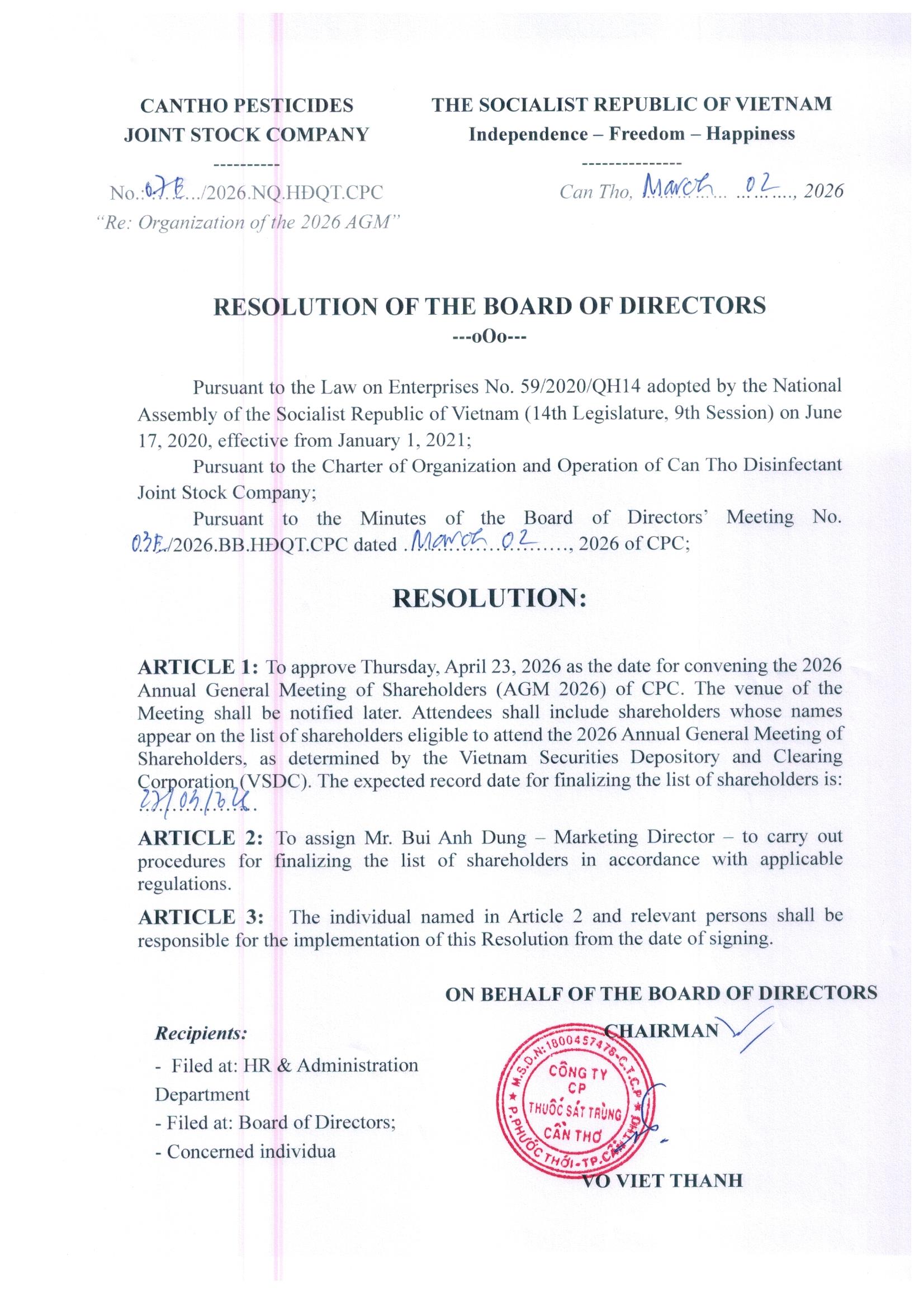 Hội đồng quản trị CPC đã có nghị quyết về việc tổ chức ĐHĐCĐ thường niên 2026. Ngày đăng ký cuối cùng dự kiến là 27/03/2026. Ngày tổ chức đại hội là 23/04/2026