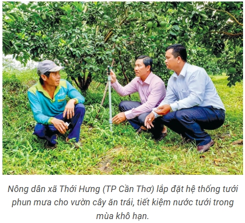 Đặc biệt, bà con nông dân không xử lý ra hoa rải vụ, trái vụ, trồng mới trong thời gian hạn hán (nếu nguồn nước ngọt không đảm bảo cung cấp đủ cho cây); tăng cường dự trữ nước ngọt trong mương, sử dụng phương pháp tưới tiết kiệm như phun mưa, nhỏ giọt; tăng cường bón phân hữu cơ, kali, lân, nhằm hạn chế cây ngộ độc do mặn...
