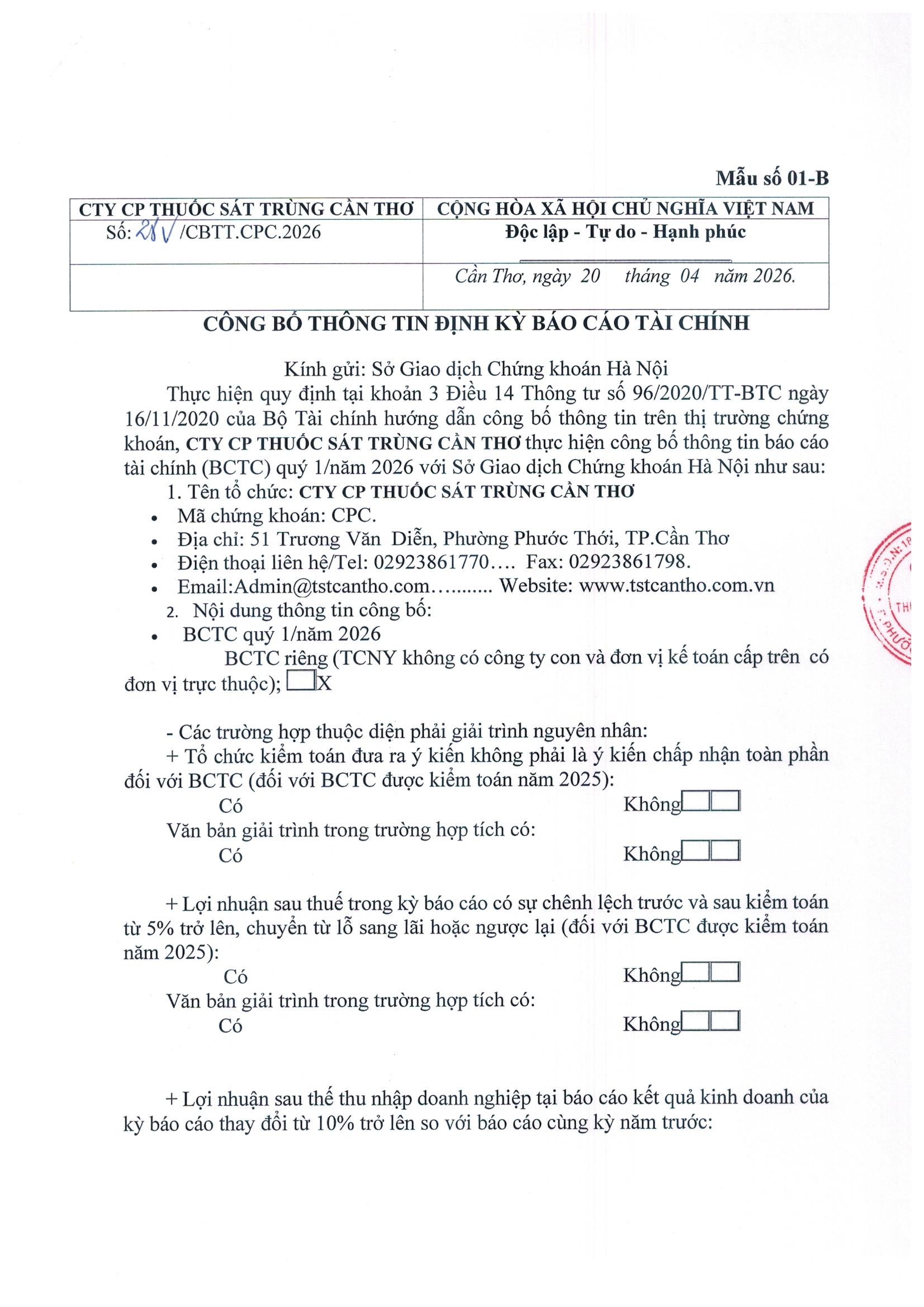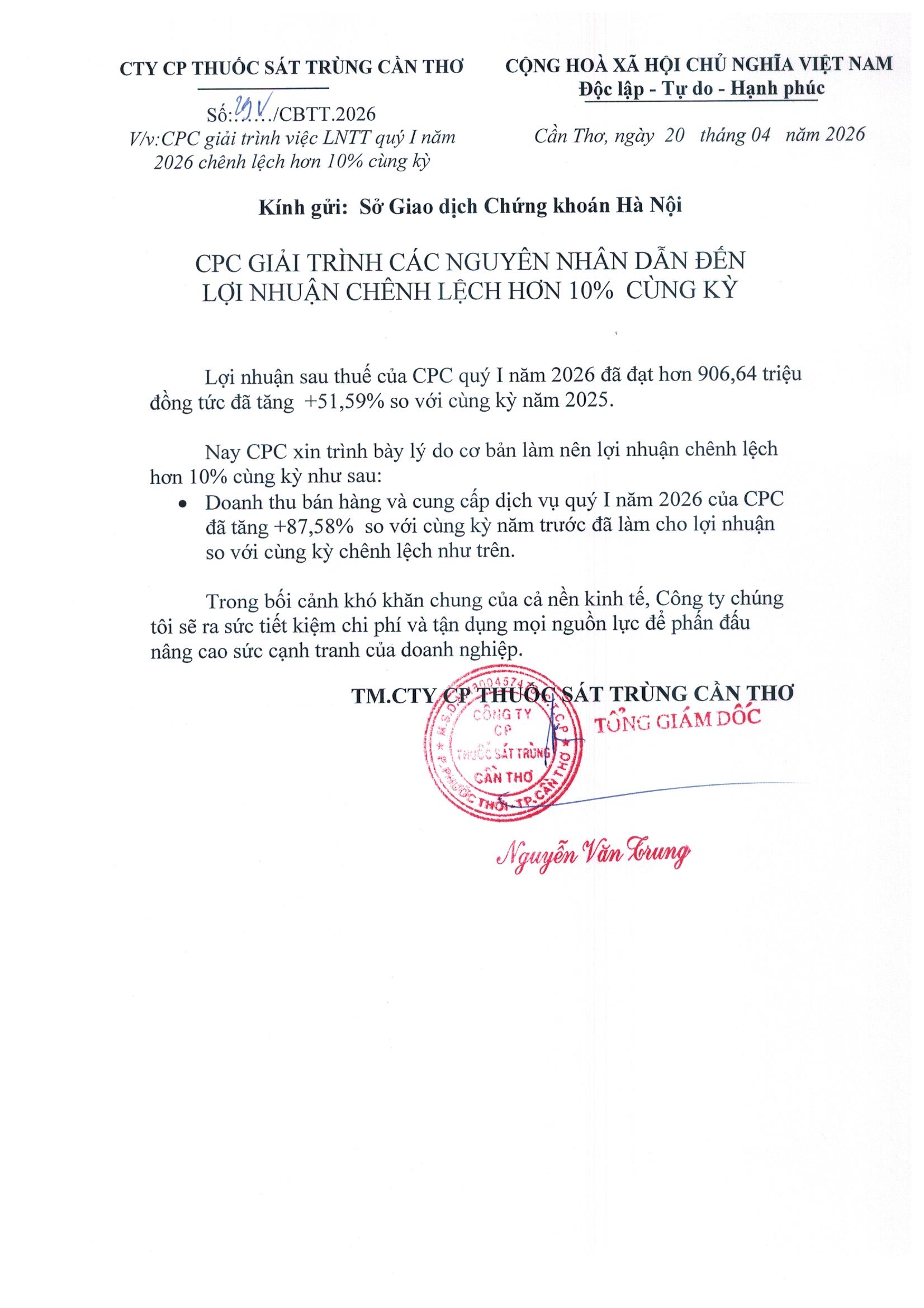 Lợi nhuận sau thuế của CPC quý I năm 2026 đã đạt hơn 906,64 triệu đồng tức đã tăng +51,59% so với cùng kỳ năm 2025. Sau đây là báo cáo tài chính quý I/2026.